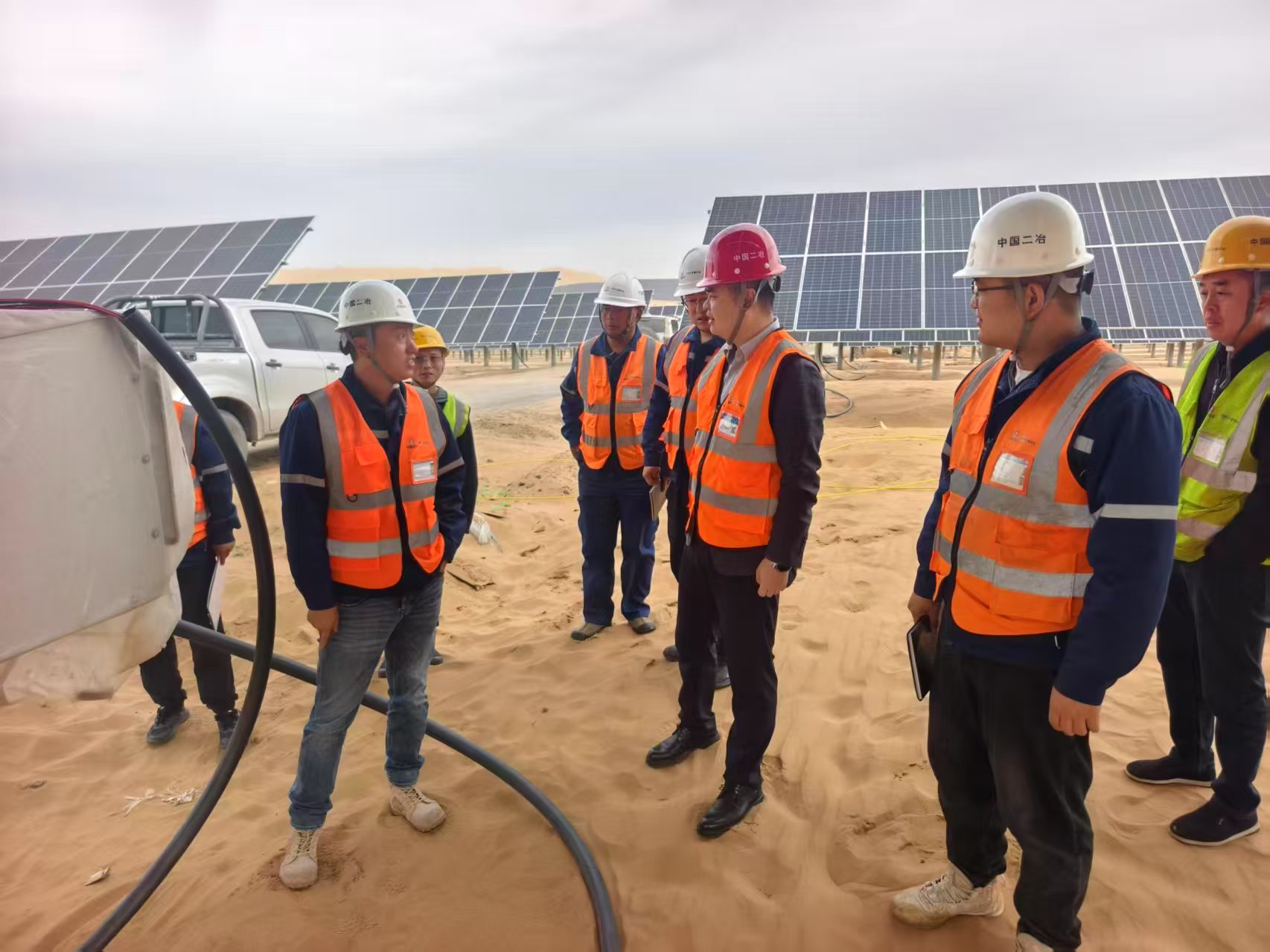 米宏達深入各子陣查看光伏組件的安裝質量和布局情況,確保光伏組件的安裝符合標準,以提高發電效率。同時,針對項目建設核心需求,米宏達提出三點要求,一是安全管理上,需針對沙漠施工風沙、高溫等風險,加強人員安全教育培訓與現場管控,增設警示標志、配齊防護設備,守住安全生命線;二是質量把控上,堅持“質量第一”,從設備采購到安裝調試全環節嚴把關,建立問題臺賬實行閉環管理,打造高標準工程;三是進度推進上,圍繞2025年11月15日并網目標,制定詳細施工計劃,加強多部門協調,快速解決建設難題,確保按期完工。?