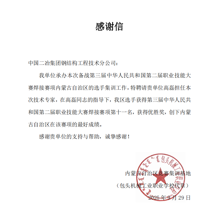 9月29日中國二冶收到內蒙古自治區競賽實訓基地感謝信,信中對中國二冶焊接高級技師高磊同志在第三屆中華人民共和國第二屆職業技能大賽中的卓越指導工作給予高度肯定,為行業技能人才培養樹立典范。